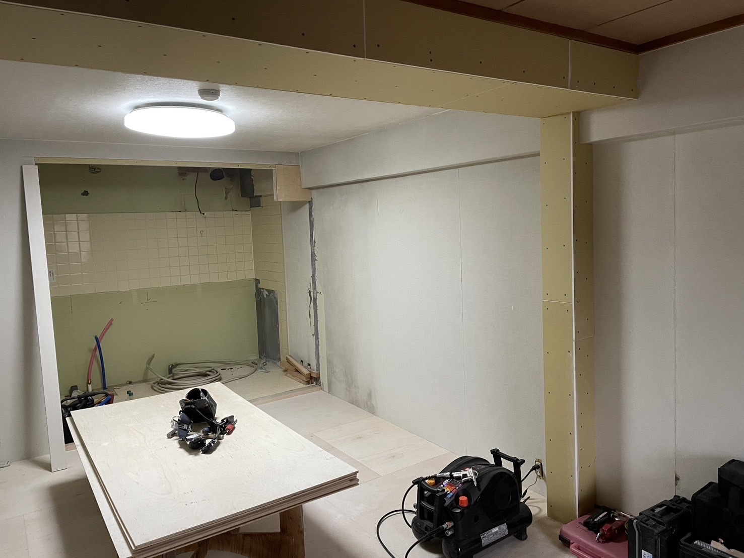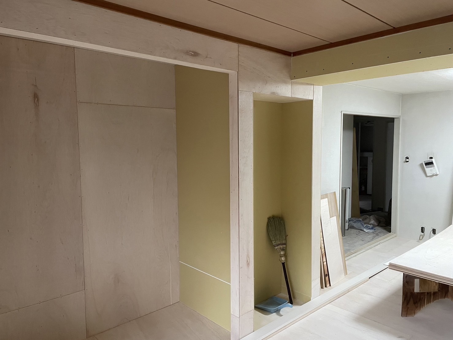 内装工事の様子です。そろそろリビングは仕上がりそうです。塗装班にバトンタッチします。その後、クロスをしてキッチンなど据えていきます。またアップします。