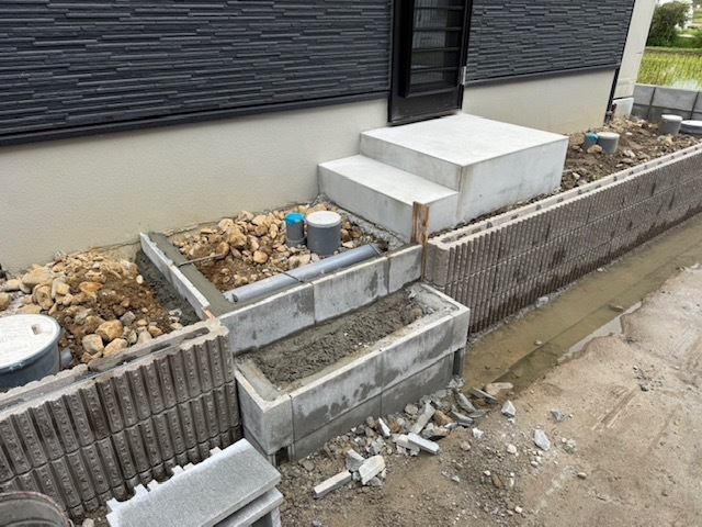 ブロック積みの続きと門柱の工事を進めました。階段部分も徐々に形になってきました。またアップします。