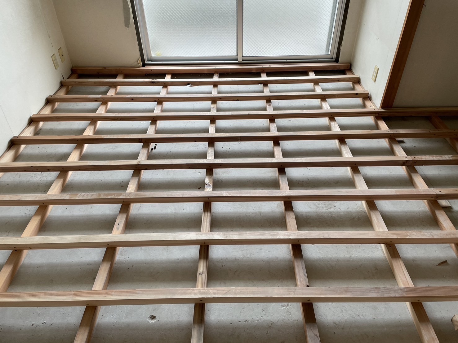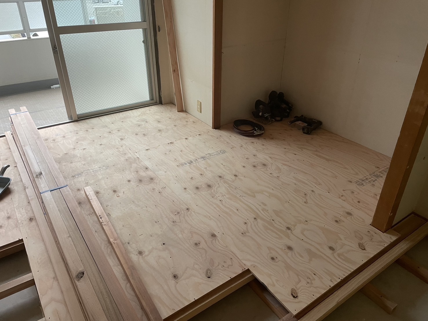 床の下地工事の様子です。クッションフロアを貼るための下地です。畳からクッションフロアに変更して押入からクローゼットに変更します。またアップします。