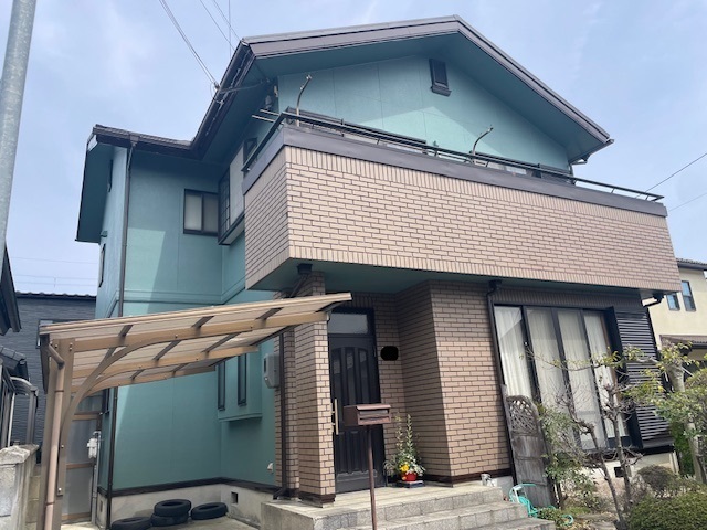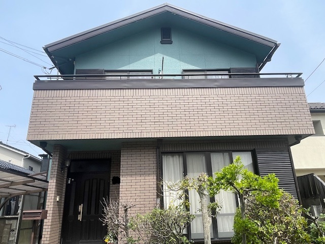 Mさま邸、完成しました。日本ペイントの標準色のグリーン系の色がとても素敵でタイル部分ともマッチしております。付帯部の茶も綺麗に仕上がりました。Mさま大変お世話になり、ありがとうございました。