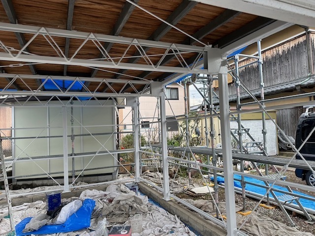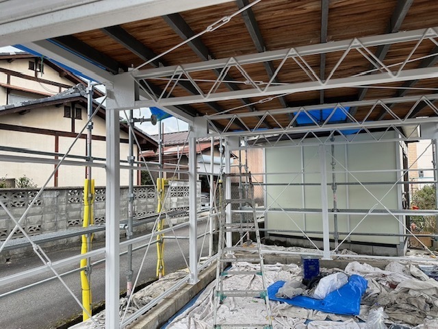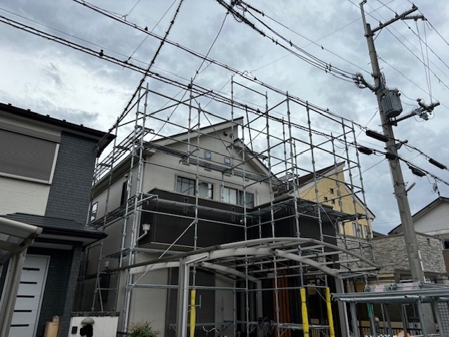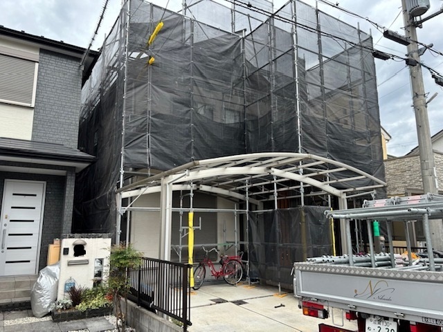 足場架設完了しました。スムーズに2名で15時くらいには完了できました。明日は高圧洗浄を行います。またアップします。