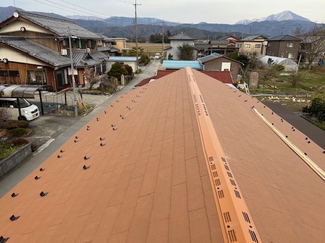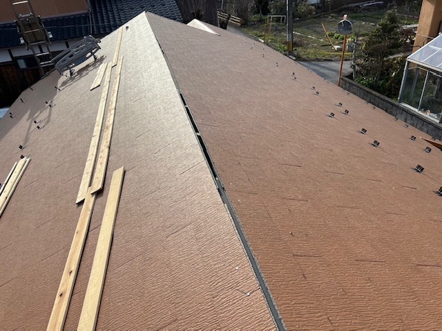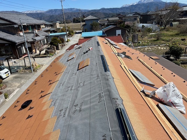 屋根の葺替え完了しました。明日は雨樋の補修や板金工事を行います。それにて完工になります。天気にも恵まれ何とか短期間で長年の雨漏りをストップさせました。最後まで丁寧に進めさせて頂きます。またアップします。