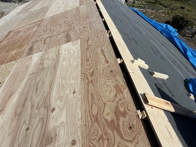 今日も下地工事です。野地板完了してルーフィングも完了です。材料の入荷待ちですのでブルーシートもしっかりして養生しました。また進みましたらアップします。