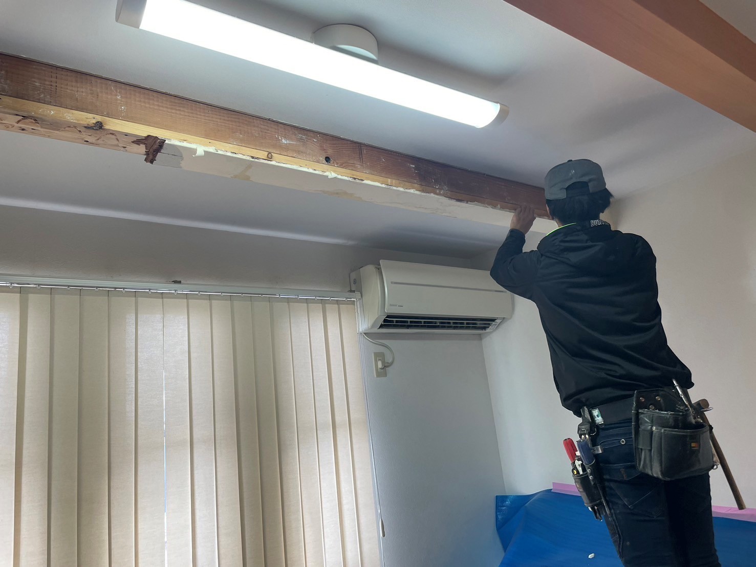 家の梁のクロスの張り替えです。雨漏りで傷んでいるので乾かしてからボード張り替えます。外部の雨漏り箇所は先日の工事で補修完了です。またアップします。