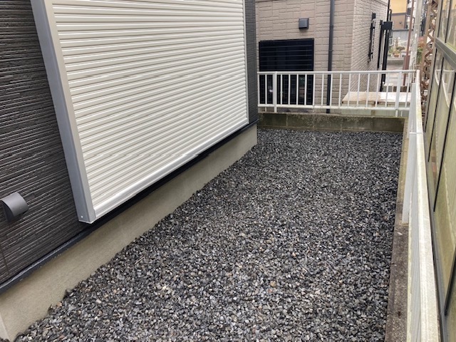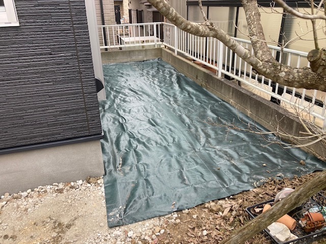 掘削・転圧整地の後に防草シートを敷いて砕石を撒きました。外構職人さんが綺麗に仕上げてくれました。明日からウッドデッキ・テラス設置工事です。またアップします。