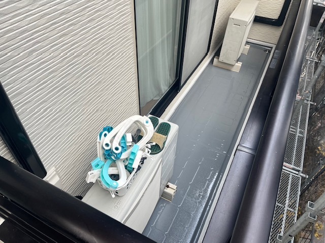 割れていたガラスの交換をさせて頂きました。ベランダ床面のトップコートも完了です。検査も完了して後は足場解体です。また完成写真アップします。