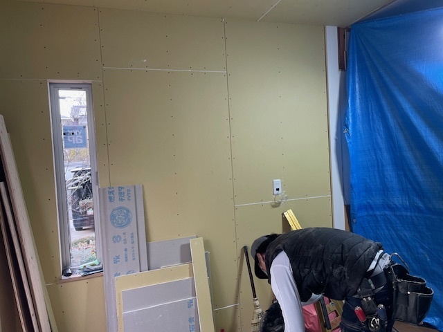 壁のボード貼りの様子です。大工作業はもう少しです。細かなチリの合わせなど苦労してくれてますが綺麗に仕亜画手くれてます。明日はお休みで明後日に屋根葺きます。またアップします。