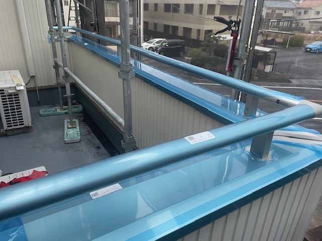 養生作業完了です。帯や付け柱にプリントのシートが貼っていて捲れているのでケレン作業も開始しました。またアップします。