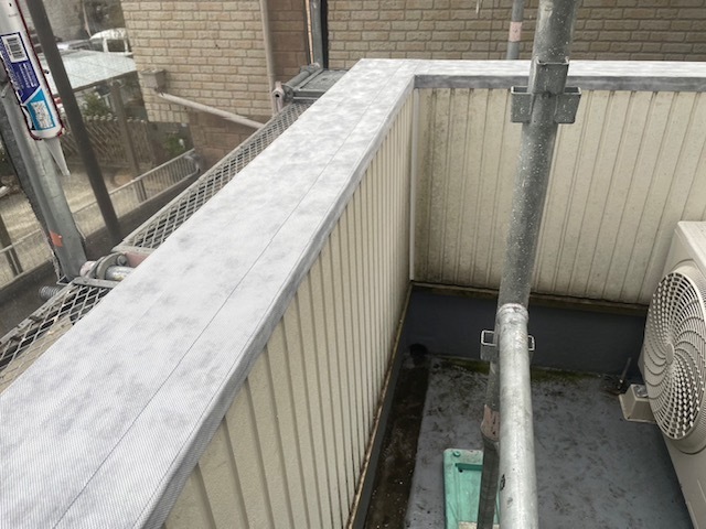 ベランダ手摺交換させて頂きました。雨仕舞いも天端にサイディングを敷いてコーキング施工しその上からブチルテープで完璧に水仕舞いしてからの手摺設置です。来週月曜日から高圧洗浄からの塗装工事スタートです。またアップします。