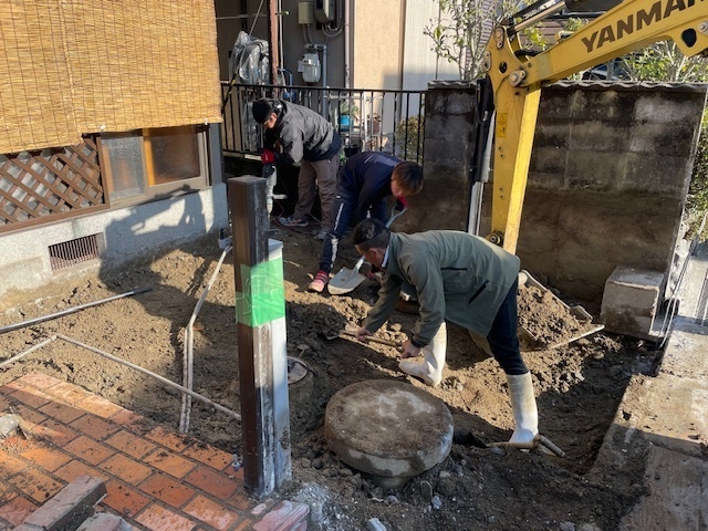 外構工事スタートです。既存の花壇や庭を撤去していきます。今回この部分はスロープ型の駐車場になる予定です。明日は天気良ければブロック積んでいきます。またアップします。