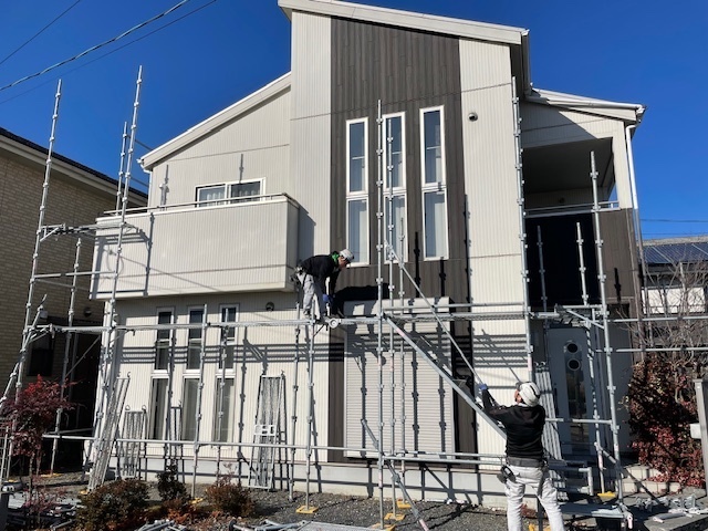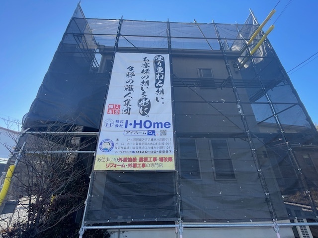 足場架設完了です。去年の後半からなのですがイメージシートが新しくなりました。カンバンなどもこのデザインで統一しようと思っております。明日からはサイディング工事です。またアップします。