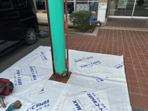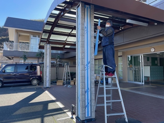 円柱で破損していた柱の新規工事です。今度は角の柱に仕上げてます。18mmのサイディングで重厚感のある柄を採用しました。立派な建物のエントランスによく似合います。またアップします。