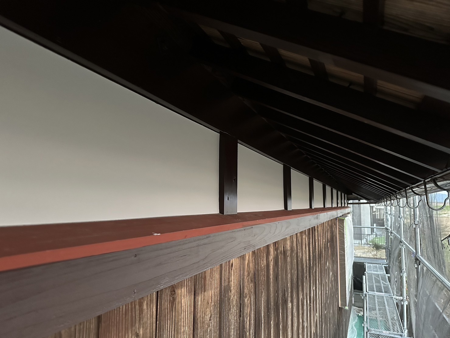 今日で軒天は終わりあと帯笠を塗装すればベンガラ完了です。杉板部分も今日から中塗りスタートです。ガードラックアクアのブラウンで塗装進めてます。またアップします。
