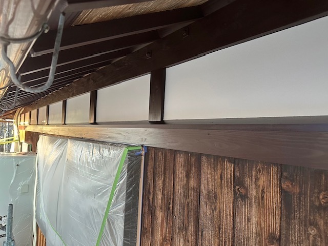 ベンガラの塗装の様子です。軒が深いので昼間でも足場の中は暗いのヘッドライトをつけて工夫して少しでも綺麗に仕上がるように職人さんがチェックしながら進めてくれてます。またアップします。