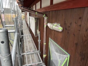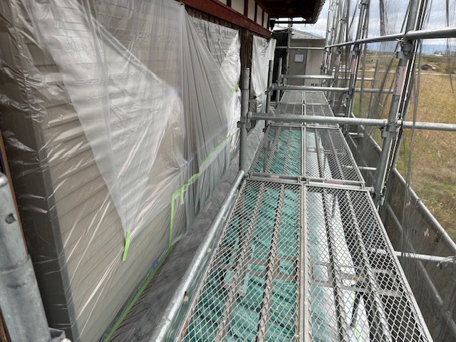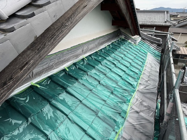 今日も養生作業進めております。総下屋なので瓦の養生もしっかり行います。通常のマスカー養生と違って歩行部や立つ部分は滑りにくいビニールで養生していきます。