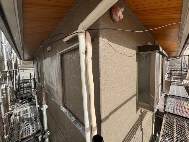 中塗りの途中で終わったいたので完成させて上塗りまで進めました。上塗り完了後は雨戸も少し進めました。明日はお休みして月曜日には塗装工事空けて雨樋の撤去をする予定です。またアップします。