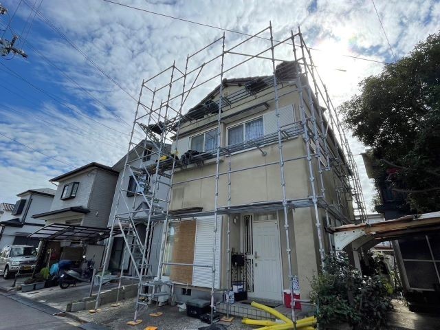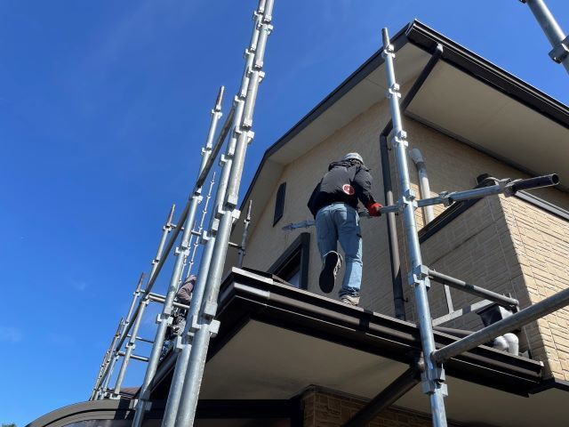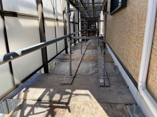 足場架設の様子です。ウッドデッキ上も足場職人が傷がつかないように丁寧に養生して足場架設してくれました。明日は高圧洗浄します。またアップします。