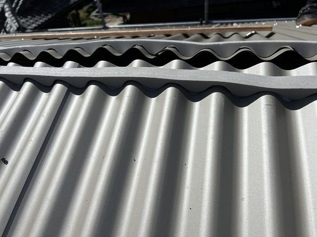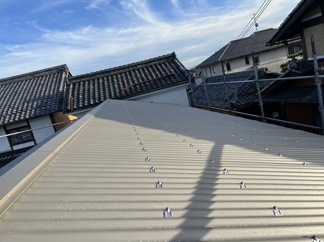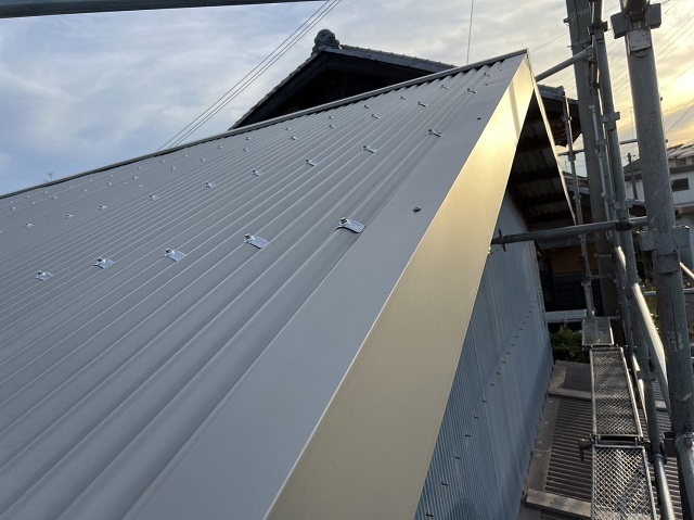 スレート屋根のカバー工法です。ガルバの小波で施工しております。明日には雨樋も完成です。車庫なので早めに足場解体しないとご不便ですので月曜日には足場解体したいと思ってます。またアップします。