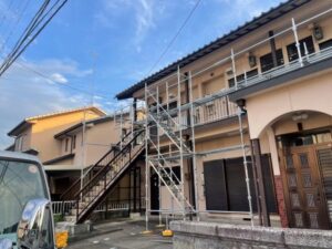 雨樋の交換工事をさせて頂きます。足場架設完了です。月曜日から樋の撤去して交換工事スタートします。またアップします。