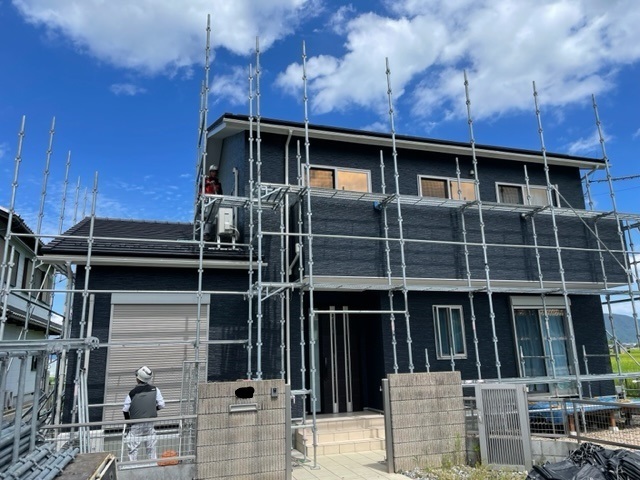 Yさま邸も順調に進み手直しと検査のみになりました。今日はメッシュシートを外してお客様にも仕上がりを見てもらえるようにしました。ポイント色もメイン色にマッチして素敵な仕上がりです。
