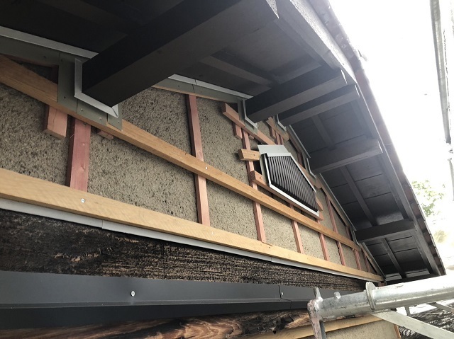 切り妻の部分の役物工事です。ガラリや桁の廻りにも板金加工していきます。引き続き役物板金を施工していきます。またアップします。