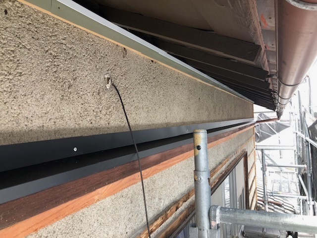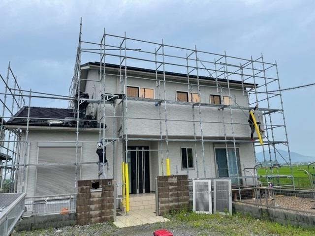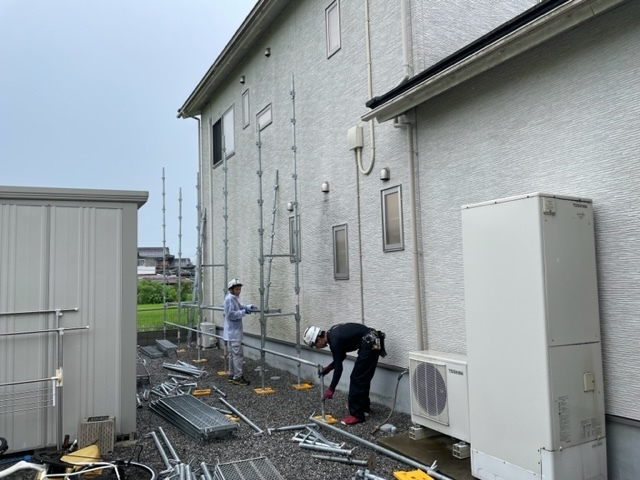 足場架設の様子です。雨のなか足場職人が頑張ってくれました。いつも以上に現場に訪問し安全を確認しながら作業進めました。無事に足場架設完了です。明日は高圧洗浄予定しております。