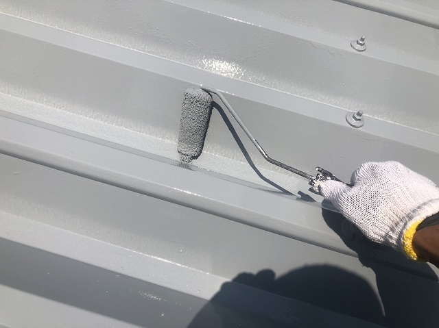 折板屋根の塗装工事の様子です。アイホーム水口支店(仮称)の開店準備です^^上塗り完了したので明日はサビヤーズをボルト部にキャップしていきます。同時にコーキングの打ち替えの抜き取りも始めました。またアップします。