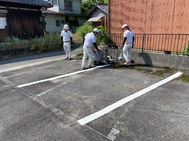 駐車場のライン引き完了です。綺麗に仕上がりました。定期的に工事をすると入居者様にも喜んで頂けます。水曜日からは足場架設し塗装工事も実施します。またアップします。