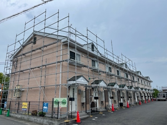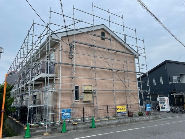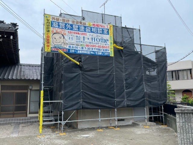 足場架設完了です。天気見ながら工事進めて行きます。