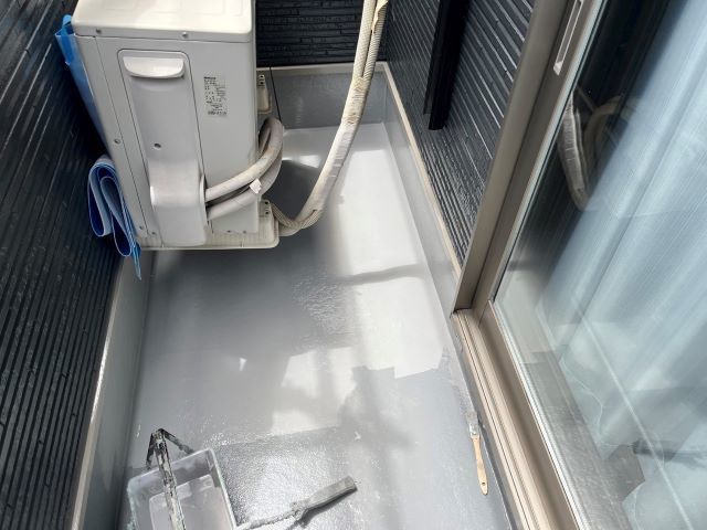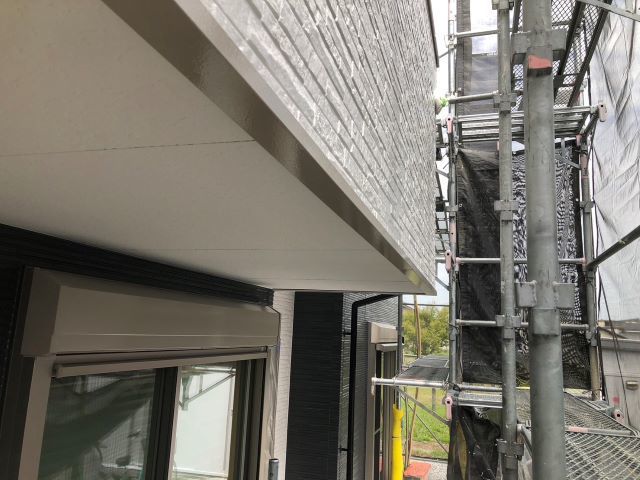シャッターボックスケレン後に塗装しました。オーバーハングやスリムダクトも完了です。ベランダのトップコート、ウレアックスHGで完了しました。いよいよ明日は検査です。またアップします。