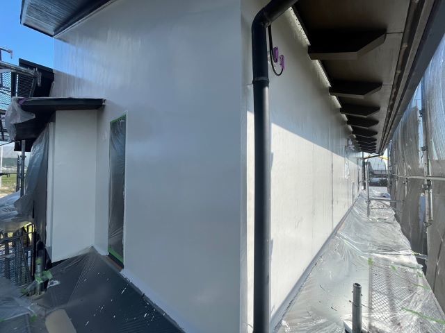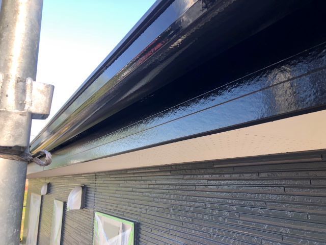 外壁のメイン色の上塗り完了です。軒樋と鼻隠しの塗装も進めました。またアップします。