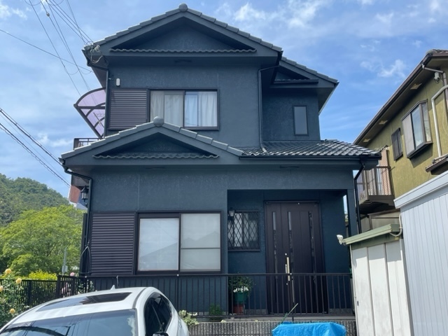 Tさま邸完成写真です。濃いグレーでかっこ良く仕上がっております^^雨戸やサッシの茶系がポイント色になって良い感じに外壁色とマッチしております。屋根もディープグレーで素敵です。完成写真を今日撮影していたら近所の方から綺麗になったね~私も名刺ちょうだいと声をかけて頂けました。施主様に喜んでもらえるのはもちろん多いですが今回はご近所の方にも喜んで頂けました^^