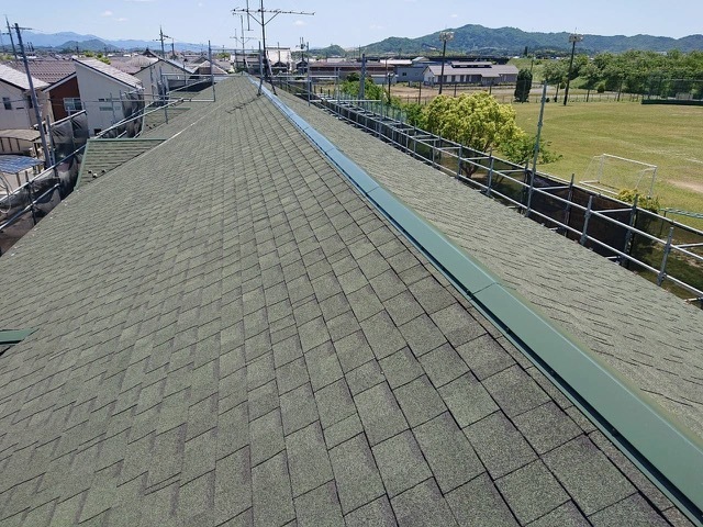 Oさま邸の足場解体後の様子です。綺麗に仕上がっております。遠くから見てもグリーンの屋根が素敵です。明日は手直しや仕上げ作業に入って行きます。またアップします。
