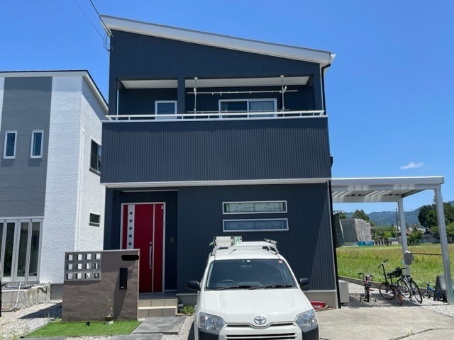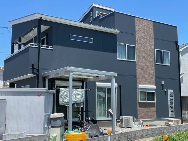 Kさま邸の完成写真です。日本ペイントの無機塗料で仕上げました。ポイント色も素敵でメイン色とマッチしております。お家の形にもよく似合う色合いでカッコ良いです。Kさま数ある塗装店からアイホームを選んで頂き誠にありがとうございます。本当にお世話になりありがとうございました。