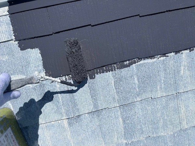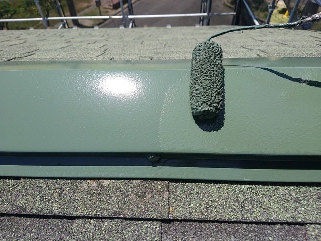 コーキング工事の様子です。オートンイクシードで仕上げ打ちしております。屋根の板金塗装も完了です。綺麗に仕上がっておりますまたアップします。