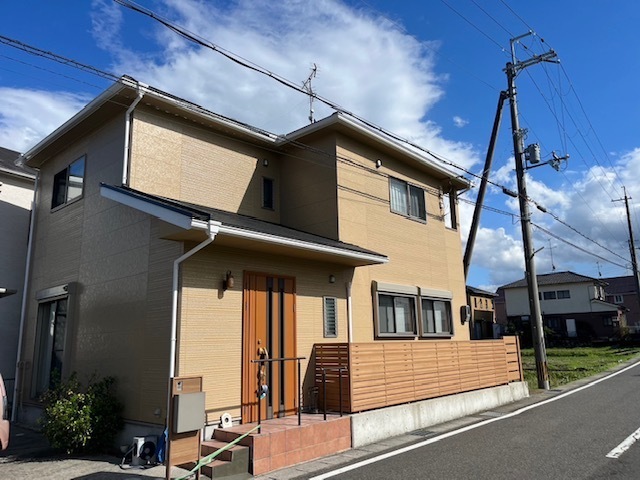 Yさま邸、塗装工事完了です。外構工事もあと少しで完了します。電線保護カバーも撤去されてスッキリしました^^1色で今回は塗装させて頂きました。優しい色合いでとても綺麗に仕上がっております。外構工事が続きますのでまたアップします。