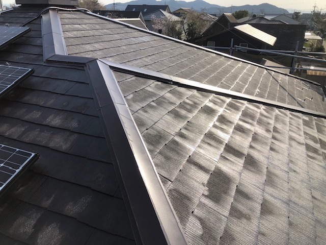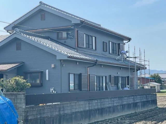 足場解体の様子です。下屋の瓦が足場の足で一枚割れてましたが明日しっかり交換します。明日波板の交換と玄関の庇の塗装、掃除など行ったら完成です。ちょうど1ヶ月の工事になりました。屋根の追加工事も頂いておりますが一旦キリをつけて追加工事は来月また施工させて頂きます。また完成写真アップします。