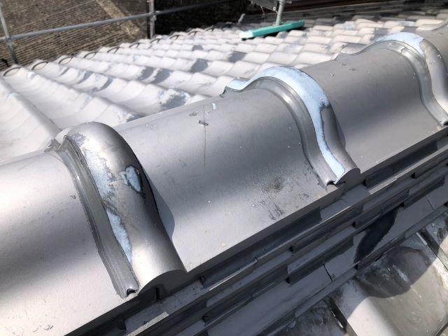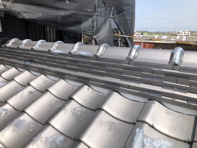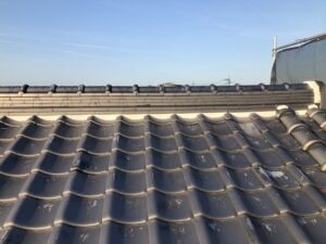 瓦のズレ止めの工事も完了しました。足場解体後は波板の交換や玄関庇の塗装を行います。またアップします。