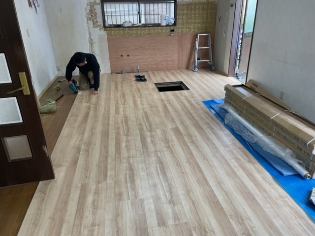 フローリング工事の様子です。綺麗に仕上がっております。明るい色で素敵です。仕上がったフローリングの上に新しいキッチンが月曜日に搬入され工事スタートします。またアップします。