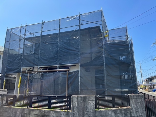 足場架設完了です。3名で作業したので午前中には完了しました。明日は高圧洗浄を実施します。雨の中の作業になりますが安全作業で進めて行きます。