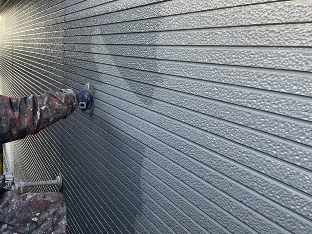 外壁の上塗りの様子です。上塗りも中塗り同様、細い目地にもしっかり塗布していきます。深いサイディング柄は特に注意して進めます。またアップします。