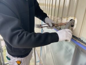 波板のテラスが雪で破損したので明日の足場架設前に撤去しました。塗装工事が終了後に新規のテラスを設置予定です。撤去したので柱の裏などもしっかり塗装出来るので頑張って綺麗に仕上げて行きます。