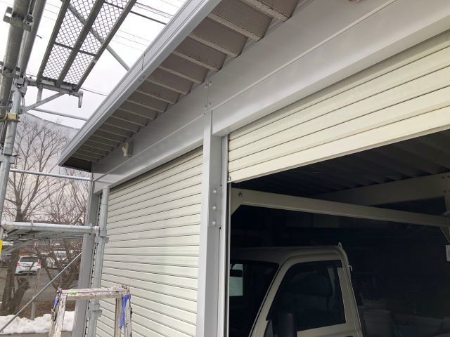 倉庫の塗装の様子です。屋根の雪が溶けきらないのでまだ部分的にしか塗装進められないですが明日はシャッターなど吹き付予定です。