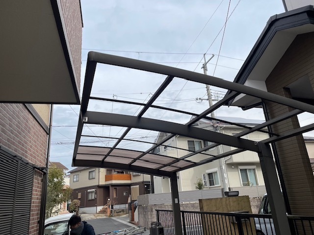明日の足場架設前の前準備でテラスのパネルやカーポートパネルを外しました。