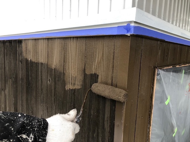 茶色のプリント部分の上塗りとガードラックアクアで杉板の塗装を進めました。