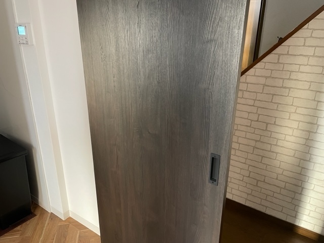 扉を新しく作成しました。去年からのリビングリフォーム工事はこの扉の完成で完了しました。お部屋の雰囲気やキッチンの色とマッチした引戸です。建具職人さんのオーダーで製作した扉なので世界に一つだけの引戸になります。