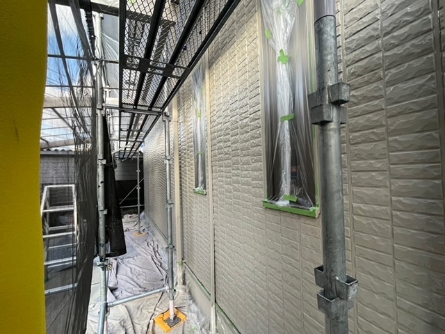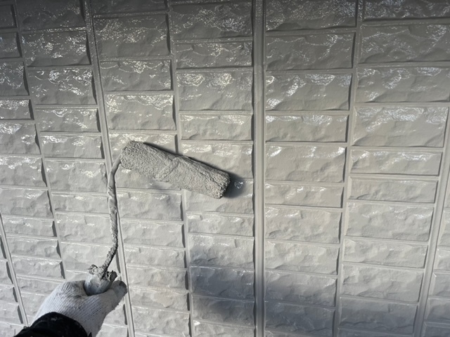 外壁の上塗りの様子です。綺麗に仕上がっております。2名で作業したので上塗りは早かったです。