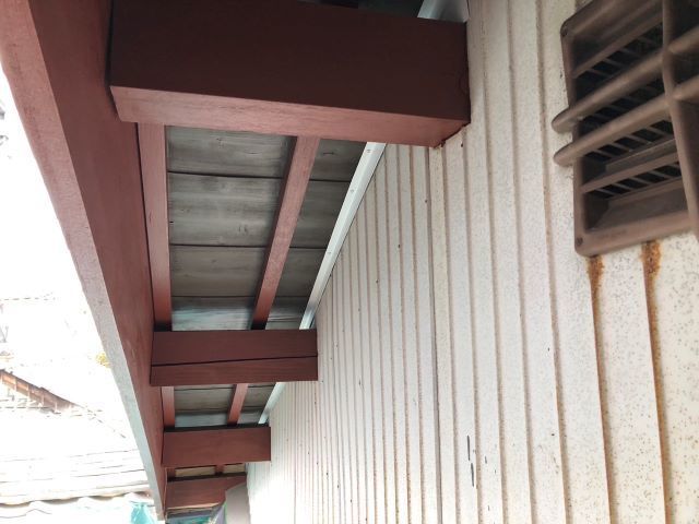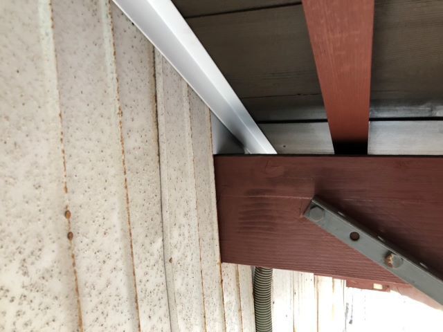 壁と軒天の際の隙間に板金を貼って行きます。日本家屋は入母屋や軒の桁廻りなど色々な隙間があるので今回はそれらの隙間を板金で埋めていきます。動物の侵入経路にもなりやすいので塗装して足場するときにお願いされること多いです。明日からは白のプリント部の錆止めなど塗布して行きます。
