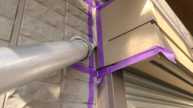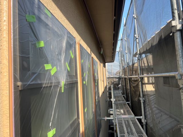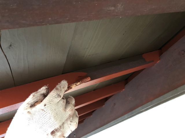 今日は下屋の軒天の垂木の塗装を進めて行きました。