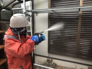 風がきつかったら洗浄も中止しようと思いましたがこの現場は午前中、風が弱かったので洗浄しました。
